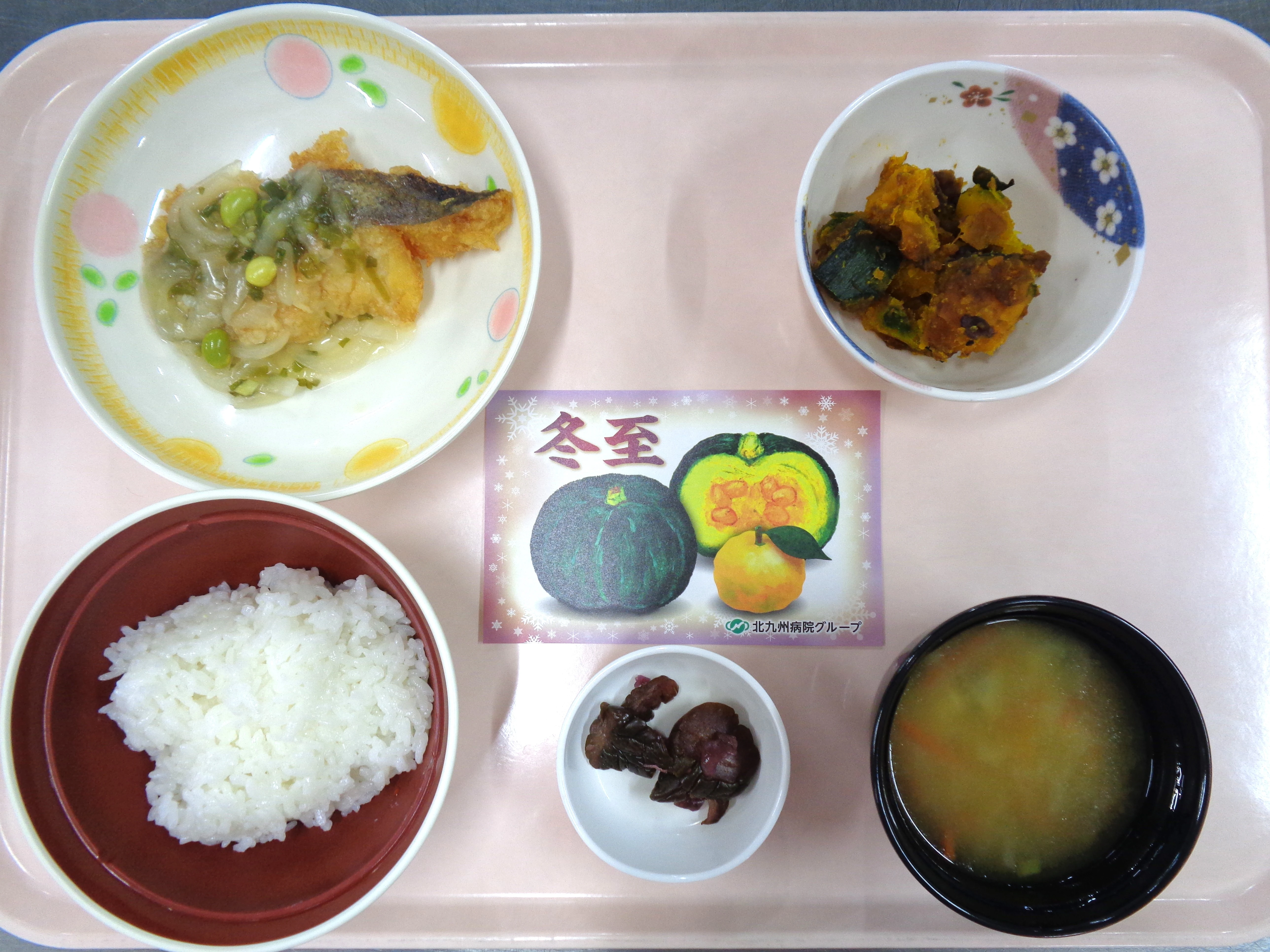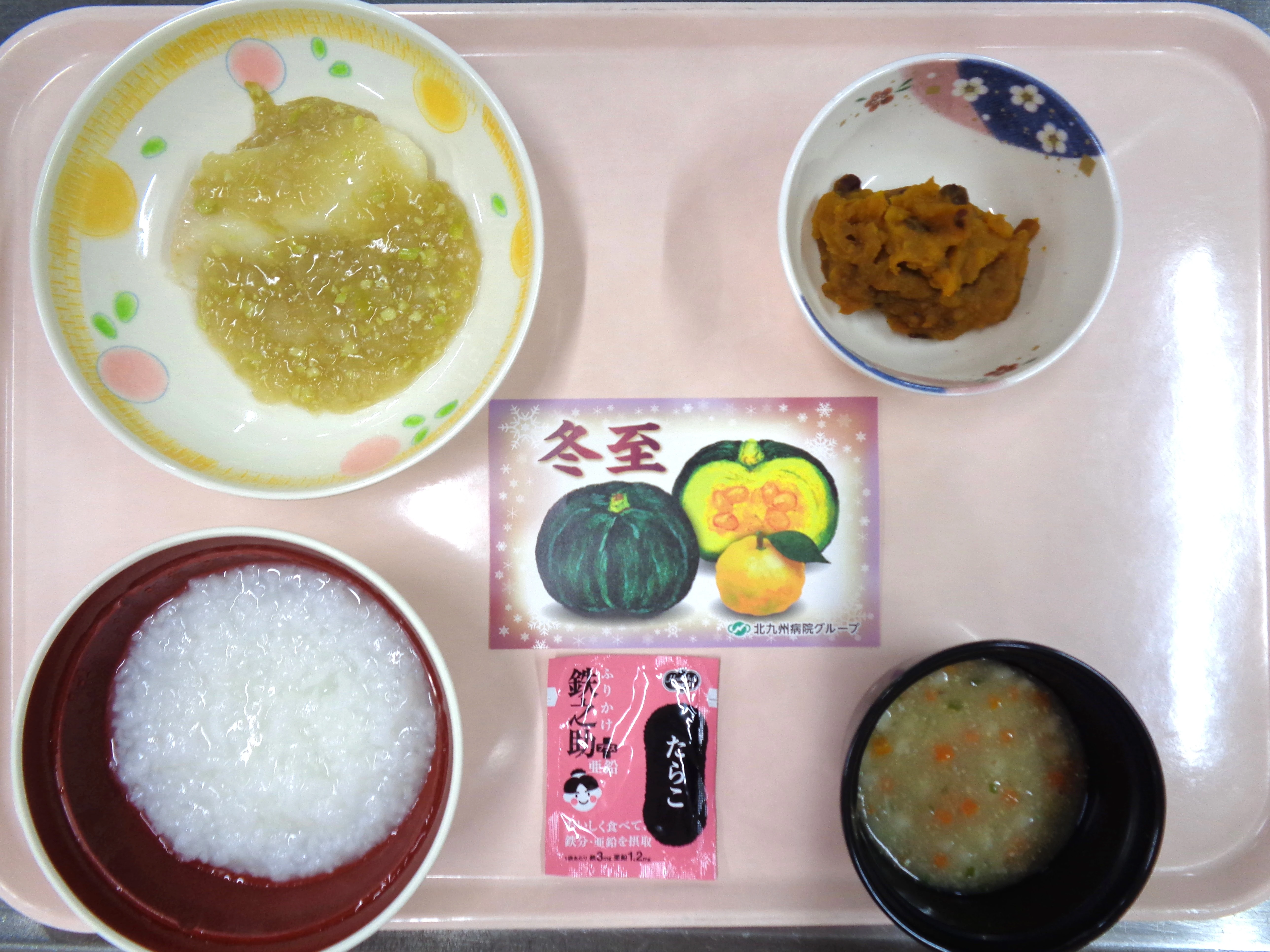 【常食】 ・魚の天ぷら葱ソースかけ ・南瓜のいとこ煮 ・根菜汁 ・漬物 【粥ケア食】 ・魚の葱ソースかけ ・南瓜のいとこ煮 ・根菜汁 ・ふりかけ